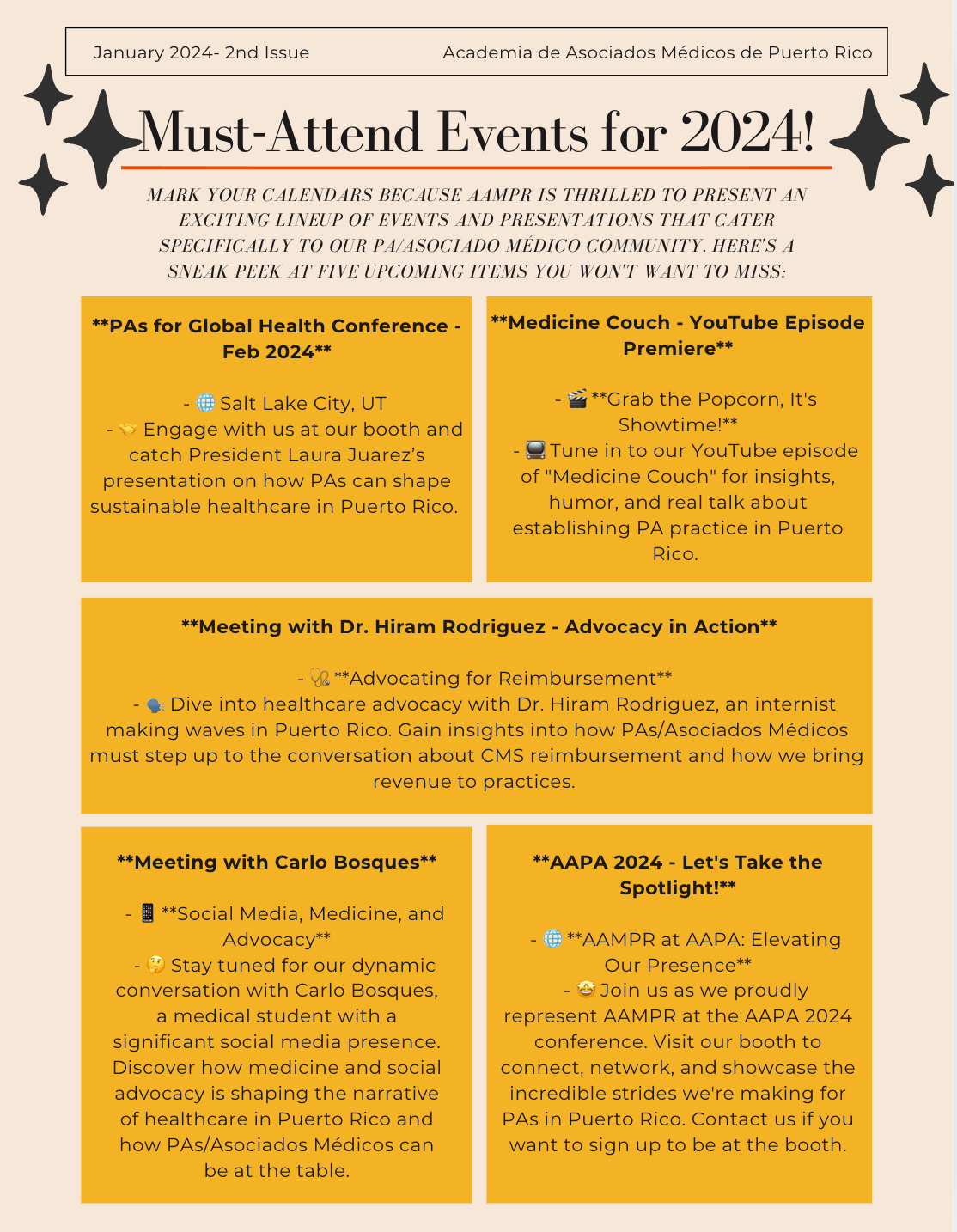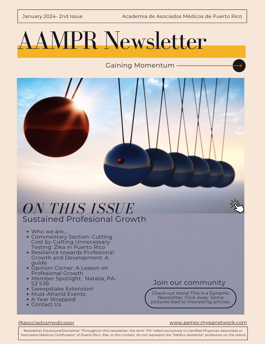 The AAMPR Newsletter is dedicated to advancing awareness, advocacy, and professional dialogue for Physician Associates in Puerto Rico. This issue focuses on sustained professional growth, featuring reflections on cost-conscious care, professional development, member highlights, and community engagement.