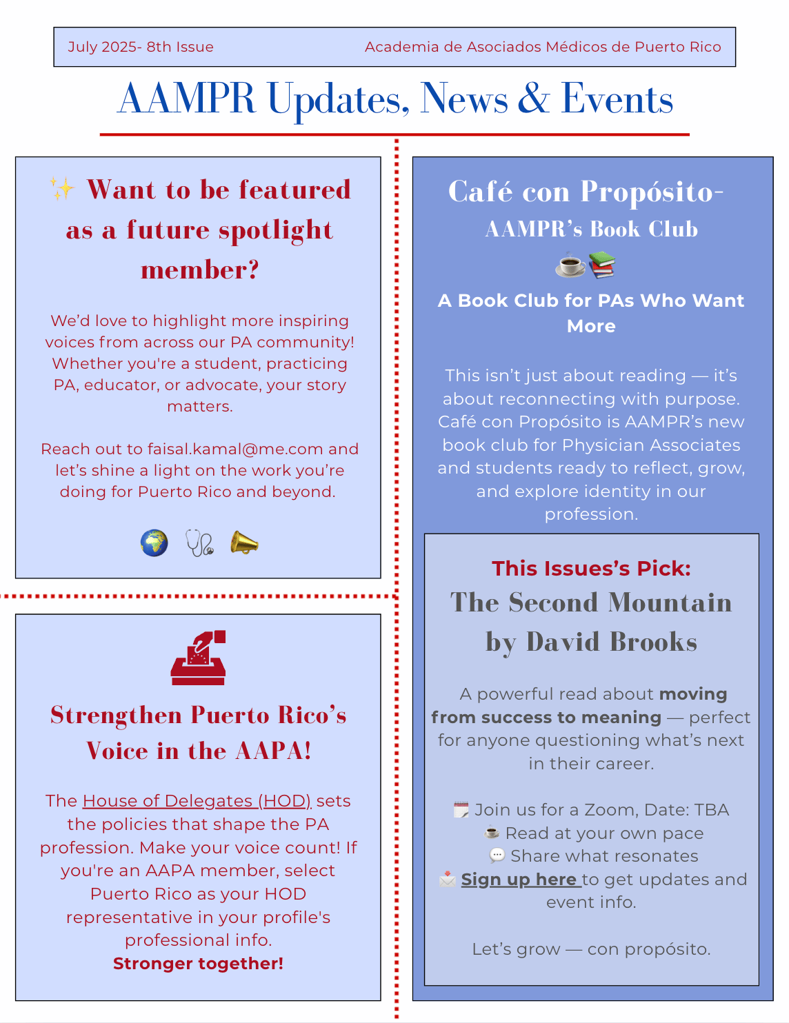 The AAMPR Newsletter is dedicated to advancing awareness, advocacy, and professional dialogue for Physician Associates in Puerto Rico. This issue centers on elevating our identity—highlighting who we are, where we’re headed, and how intentional leadership and community voice are shaping the future of PA practice in Puerto Rico.