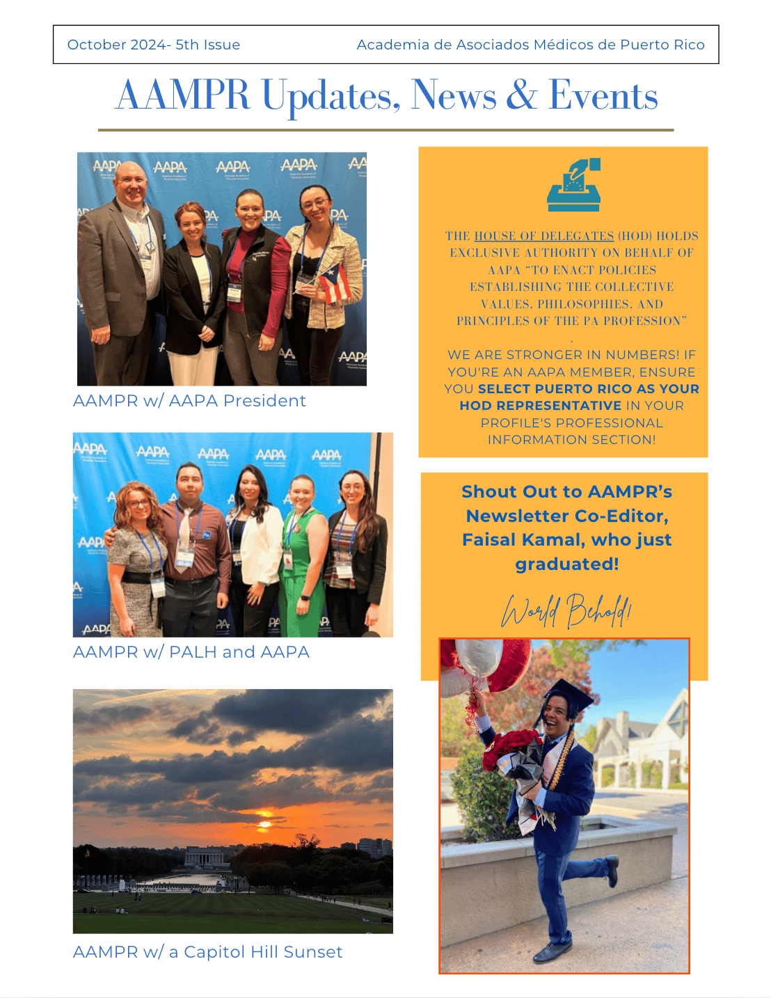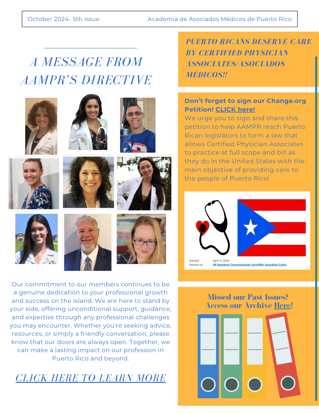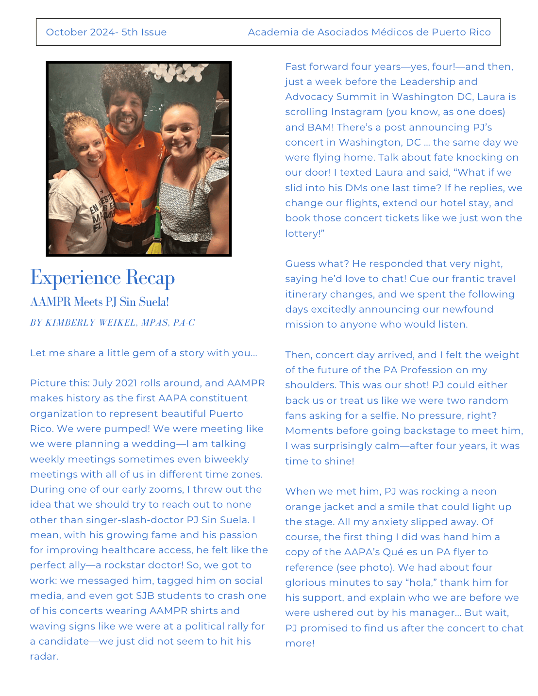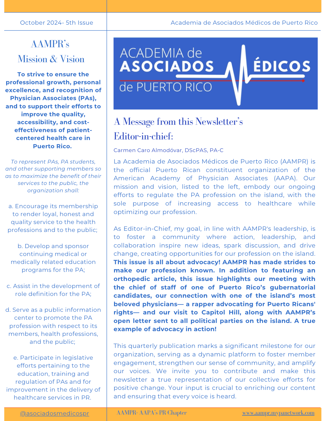 The AAMPR Newsletter is dedicated to advancing awareness, advocacy, and professional dialogue for Physician Associates in Puerto Rico. This issue captures advocacy in action—highlighting the individuals and moments where Puerto Rico’s PA community showed up, was seen, and represented the profession through leadership, presence, and collective voice.