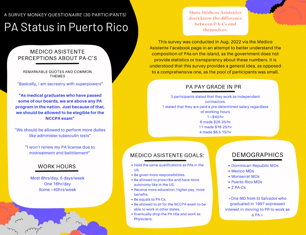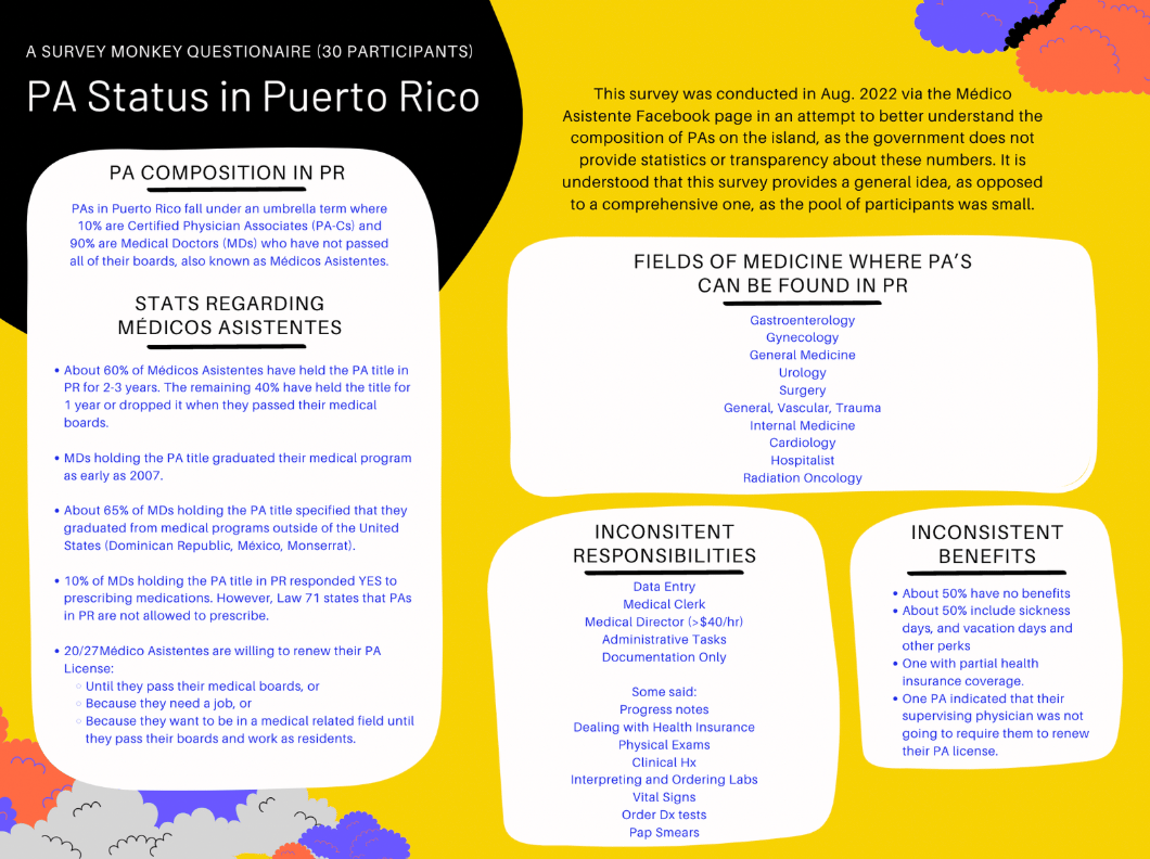 In August 2022, a survey was conducted via the Puerto Rico Médico Asistente Facebook page to better understand the composition of PA title holders on the Island. This effort was necessary due to the lack of government-provided statistics and transparency regarding these numbers. It is important to note that this survey provided a general idea rather than a comprehensive one, given the small pool of participants.